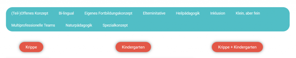 Wenn Du auf einen Filter klickst, kommst Du auf eine neue Seite. Dort sind nur noch die Kitas, auf die die Kategorie zutrifft. Du kannst auf die Logos der Kitas klicken. Die Webseite der Kita geht dann auf.